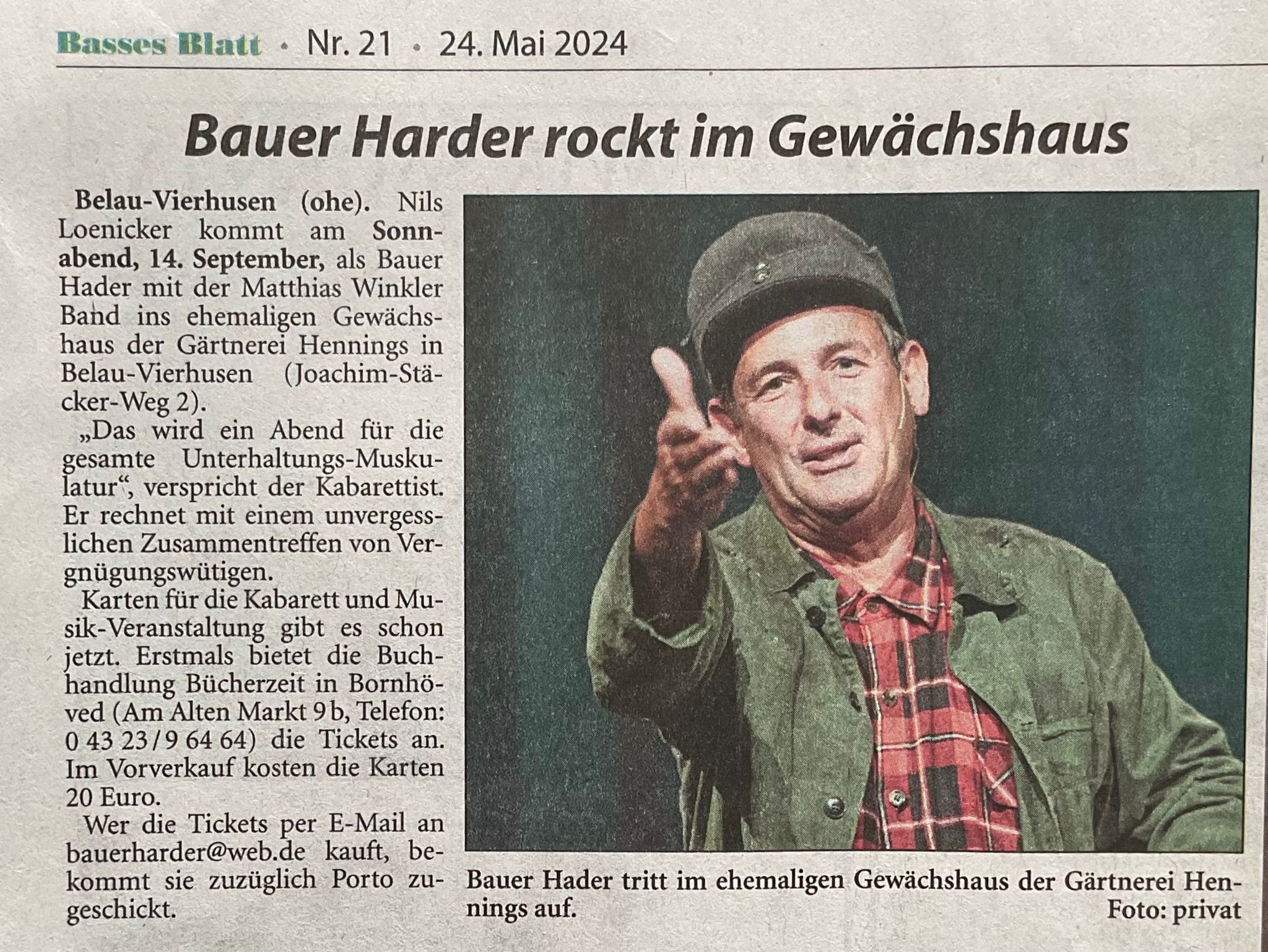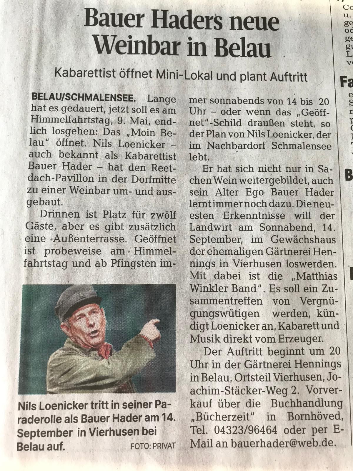 22.08.2010 Lübecker Nachrichten "Kabarett auf dem Dorf: Bauer Hader rockte Schmalensee" PDF
